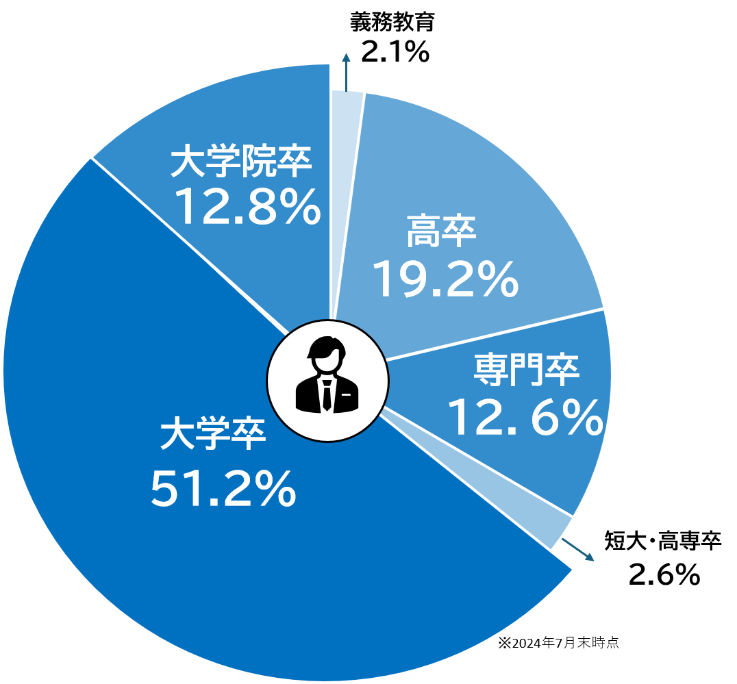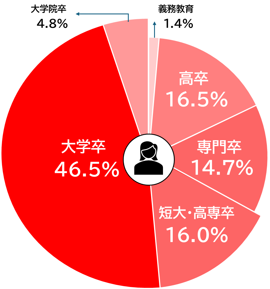 男性・女性ともに大卒以上の割合は50%以上で、また高卒や短大卒の会員さまも多く活動されています。